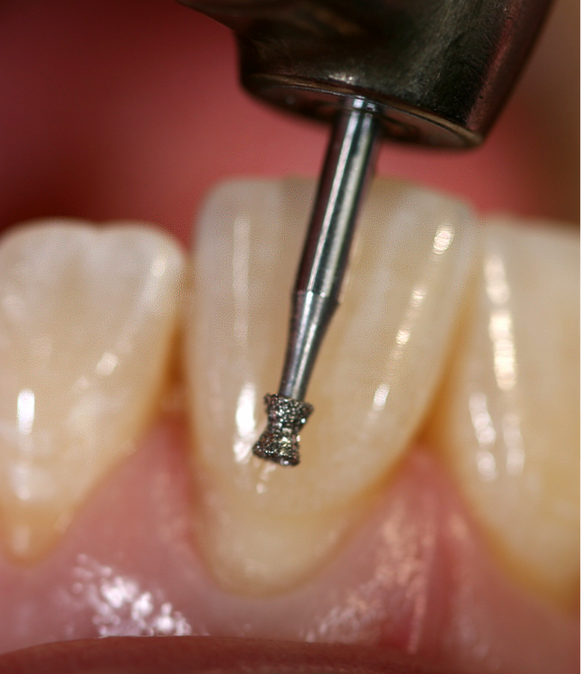 Among the armamentarium required for creating direct composite pink prosthetic restorations are pear-shaped diamonds for carefully cutting the micro box (Figure 5 and Figure 6) and a marginator fine flame diamond (ie, very small inverted cone diamond bur) to create undercuts or micromechanical retention (Figure 7 and Figure 8). Note that there is no radius beveling at the gingival margin; a butt joint is created that will require sealing.