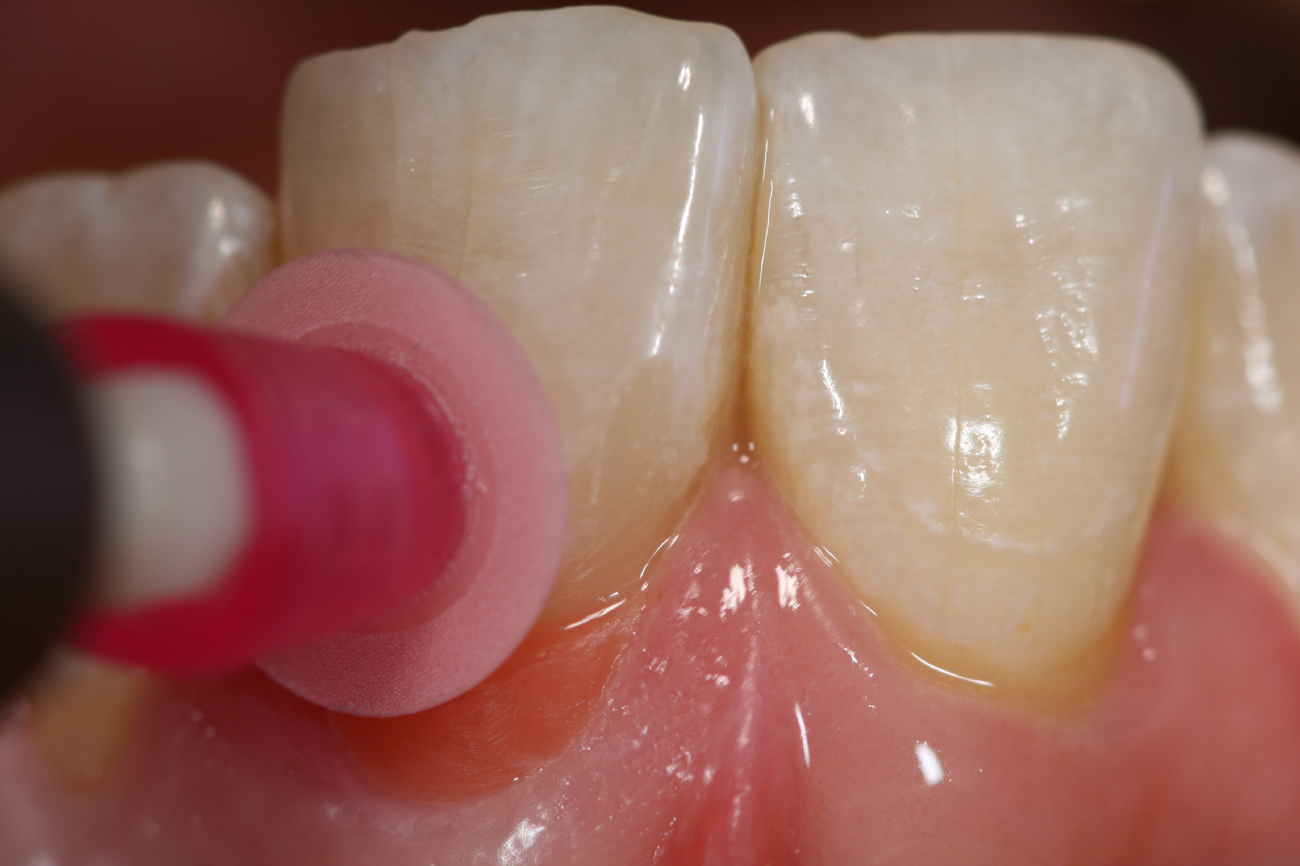 To begin finishing pink restorations, a series of finishing discs, burs, and polishers are used. First, a high luster is created—even in the tight marginal areas—using polishing discs (eg, Super-Snap X-Treme™, Green, Shofu Dental) to help decrease the likelihood of microorganisms accumulating in voids and defects (Figure 14). Then, all margins can be approximated using a polishing disc with semi-spherical particles (eg, Super-Snap X-Treme, Red) (Figure 15). A one-step aluminum-oxide polisher (eg, OneGloss®, Shofu Dental) is then used prior to imparting the microtexture (Figure 16).