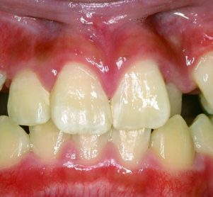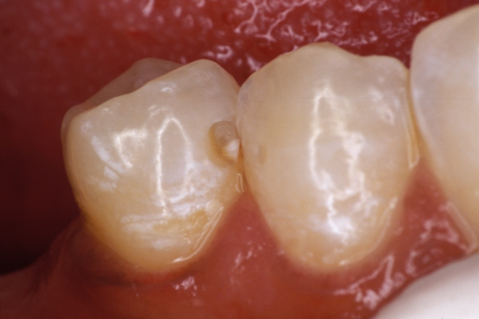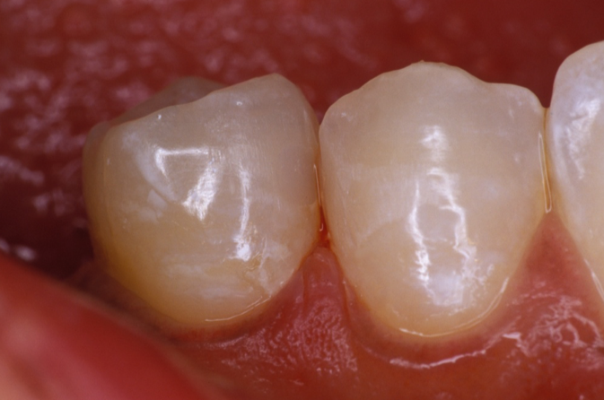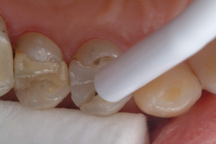 Extended-contact giomer varnish does not require acid etching for uncut enamel. It is a very thin film, so the patient will be less likely to feel it. It can be used for sensitivity or as a proactive intervention on white-spot lesions (Figure 1), exposed root surfaces (Figure 2), and erupting molars (Figure 3). Extended-contact giomer varnish is an ideal solution as a barrier against demineralization and acid erosion, which often occurs in areas that are difficult to clean, like the area around orthodontic brackets.