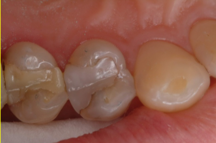 In the next case, the decay was cleaned out from the buccal surface as opposed to the occlusal, eliminating the need to remove the marginal ridge (Figure 8). Then the flowable was applied, with the restoration treated as a Class III (Figure 9). The advantage of not removing the marginal ridge was that it preserved the integrity and longevity of the tooth.