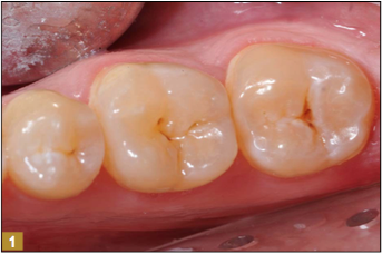 Giomer restoratives are bioactive regenerative materials that can be used where traditional direct composite materials are indicated. In the case presented in Figure 1, decay was noted on the occlusal surfaces of a first and second molar. What often looks like a very small amount of decay on the surface can lead to the discovery of significant dentin destruction. The quadrant was isolated and air abrasion was performed using 50 µm aluminum oxide (Figure 2). The occlusal groove enamel was abraded, revealing obvious decay to the dentin (Figure 3). Decay was identified with caries indicator and removed with a #2 round bur and slow-speed handpiece, with the goal of preserving as much healthy tooth structure as possible (Figure 4). Caries indicator stains denatured collagen and debris and helps to identify areas needing attention by the dentist, but equally importantly, it identifies areas without damage that can be preserved.