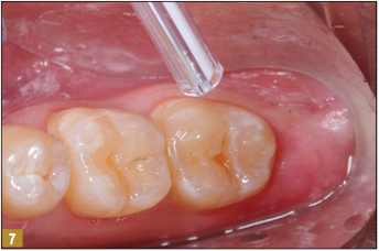 The conservative nature of these preparations allows complete restoration with a flowable Giomer. The teeth were etched with 37% phosphoric acid for 15 seconds (Figure 5). After thorough rinsing, a universal bonding material was applied with several coats and air thinned (Figure 6). Air thinning is important to remove the solvents and to provide and thin the film. The surface at that point should be visibly shiny, signifying complete, effective preparation coverage by the bonding agent (Figure 7).