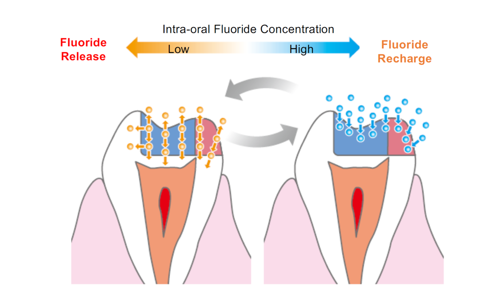 A wide range of calcium-based or calcium-containing materials have demonstrated bioactivity, such as mineral trioxide aggregate (MTA) and calcium hydroxide-containing materials (eg, various cements, pulp liners, pulp caps, root dressings). In addition to the aforementioned bioactive materials, Giomer technology is rather new to the bioactive classification of restorative materials. This new technology combines the fluoride-releasing capabilities of a glass-ionomer and the durability of a composite-resin restoration. The three main benefits of Giomer technology are fluoride release and recharge (Figure 2), decrease in acid production by creating an acid-resistant layer, and creating an anti-plaque effect. The release of fluoride is just one attribute; other ions are strontium, natrium/sodium, aluminum, silicate, and borate. Further developments to meet additional restorative clinical needs are anticipated in the newly emerging category of bioactive dental materials.